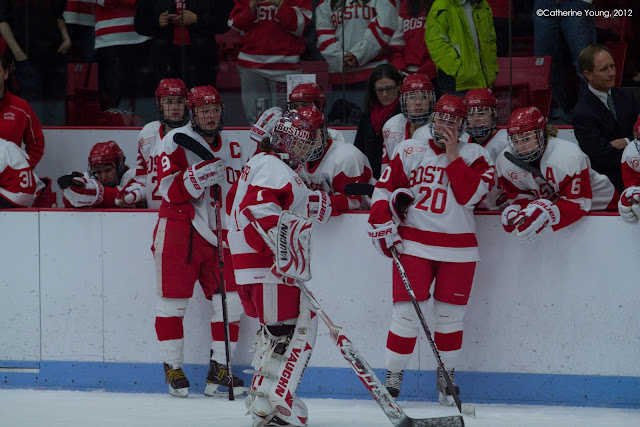 Boston, MA. Feb 7, 2012- Members of the Boston University Women's Hockey team react after losing the 2012 Women's Beanpot Championship to Northeastern University at the Walter Brown Arena in Boston, Mass. on Tuesday February 7, 2012. The BU Terriers recovered from a 2-0 lead by Northeastern University early in the game, and later lead by 3-2, before the NU Huskies tied the score and forced the game into overtime, eventually winning 4-3.