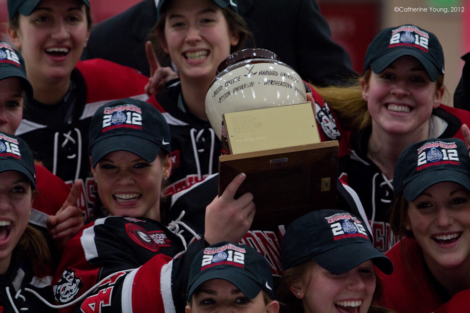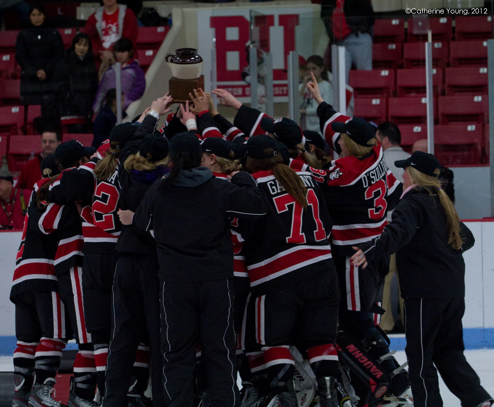 Boston, MA. Feb 7, 2012- The Northeastern University Women's Hockey team lifts their trophy high after winning the 2012 Women's Beanpot Championship at the Walter Brown Arena in Boston, Mass. on Tuesday February 7, 2012. The NU Huskies won the game 4-3 in overtime. "We didn't get down after we lost the 2-0 lead. We stayed positive in the locker room and we got ready to go. We turned it around because we knew we could do it." said Northeastern University sophomore forward Claire Santostefano (13).