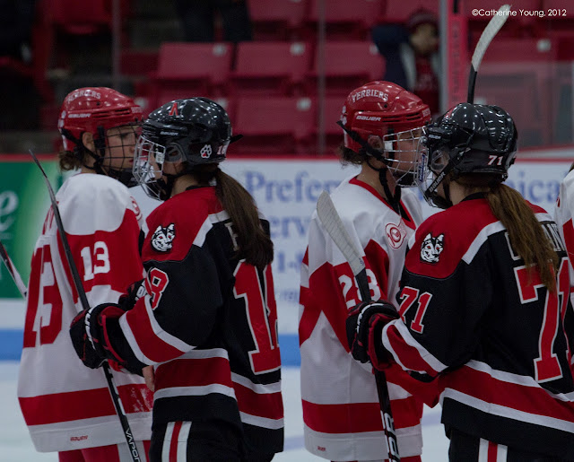 Boston, MA. Feb 7, 2012- The Boston University Women's Hockey team and the Northeastern University Women's Hockey team congratulate each other on a game well played after the conclusion of the 34th Annual Women's Beanpot Championship at the Walter Brown Arena in Boston, Mass. on Tuesday February 7, 2012. Northeastern University won the game 4-3 in overtime.