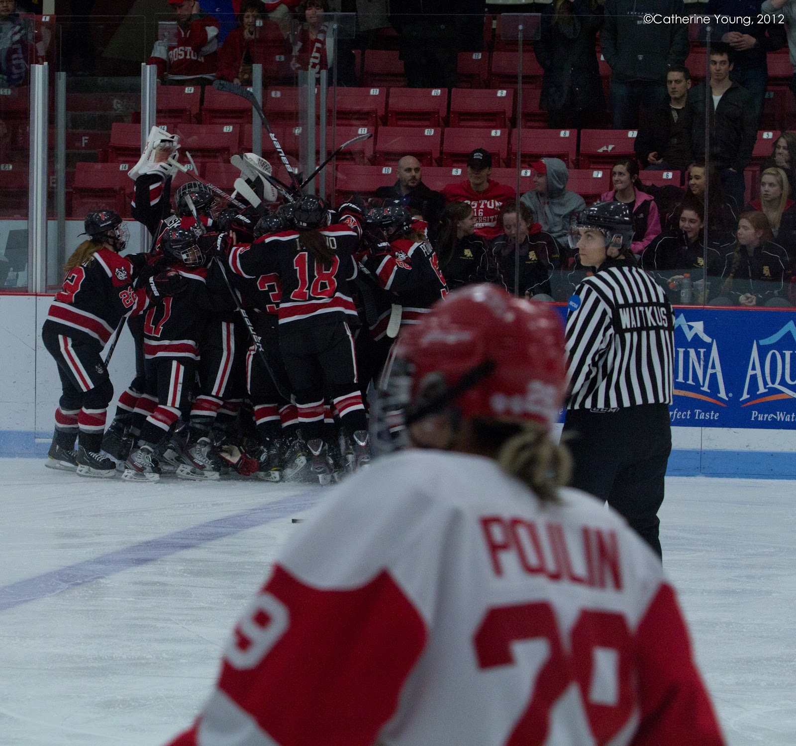 Boston, MA. Feb 7, 2012- Boston University sophomore forward, Marie-Philip Poulin watches as members of the Northeastern University Women's hockey team celebrate winning the 34th Annual Women's Beanpot Championship at the Walter Brown Arena in Boston, Mass. on Tuesday February 7, 2012. The Northeastern University Women's hockey team won the championship 4-3 in overtime after tying 3-3 with Boston University in the third period.